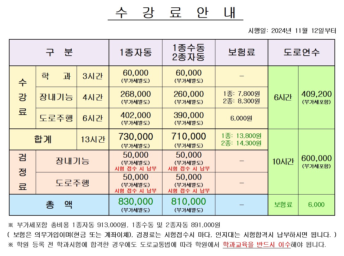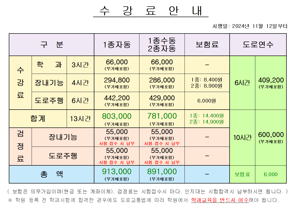 | 교육시간 수강료 | 3시간 | 4시간 | 6시간 |