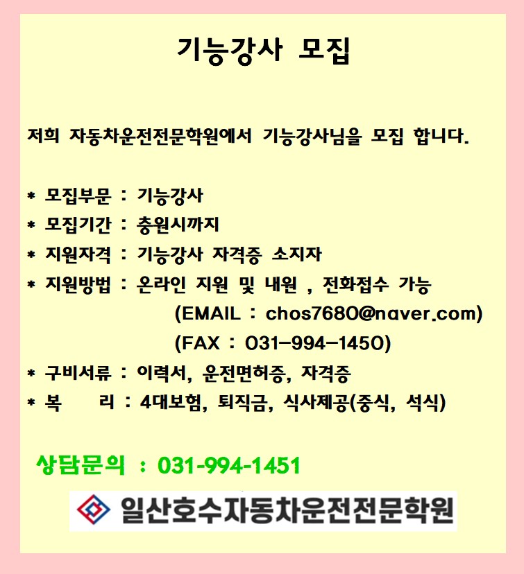 상호명 : 일산 호수 자동차운전전문학원 l 대표자 : 조병운 l 경기도 고양시 일산 동구 장대길 160 - 38 (3호선 마두역 3번출구)